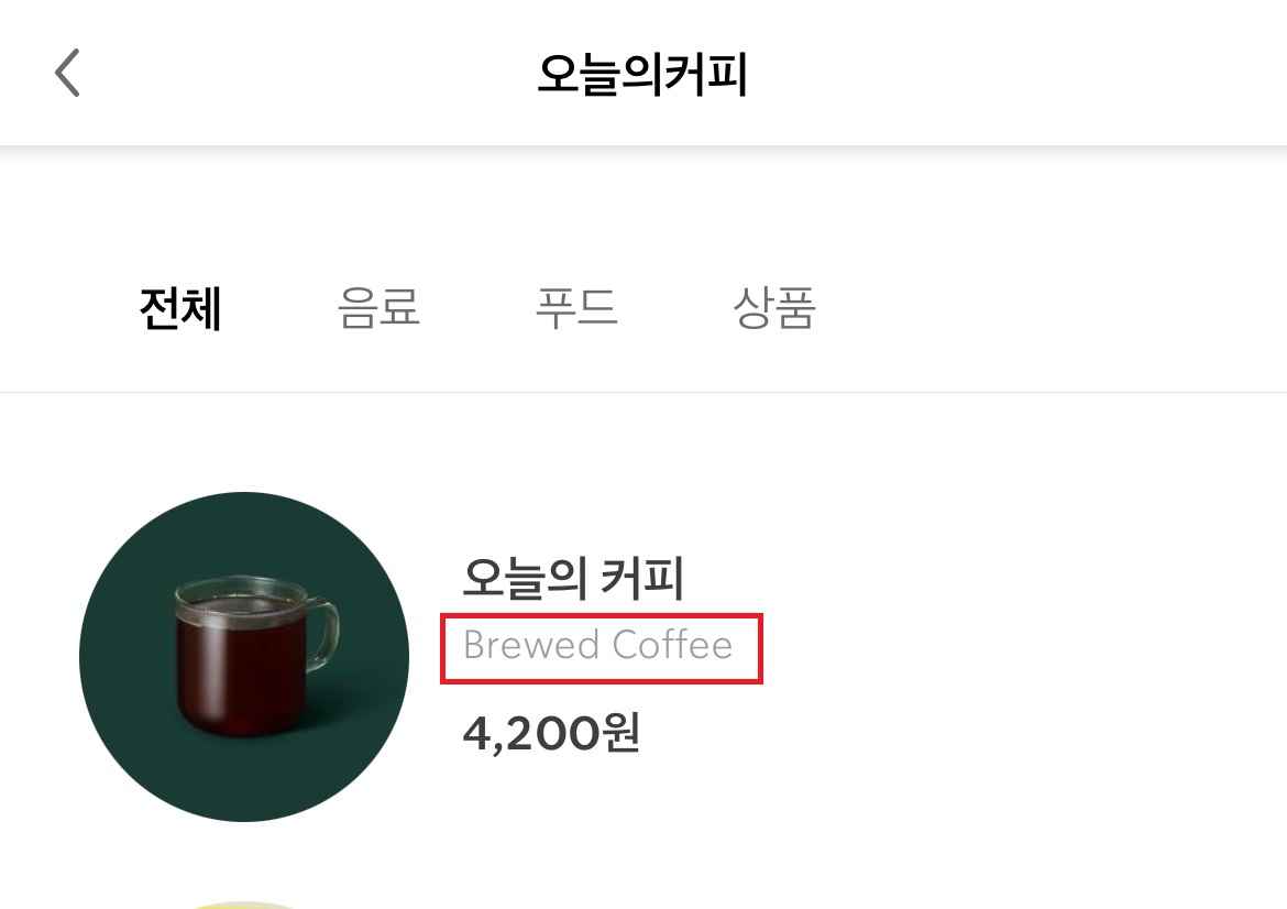 스타벅스의 오늘의 커피는 '드립 브루(Hot Brew)'에 속합니다. 오늘의 커피 메뉴 하단을 자세히 읽어보시면 'Brewed Coffee'라고 쓰여 있는 것을 확인하실 수 있으시죠?